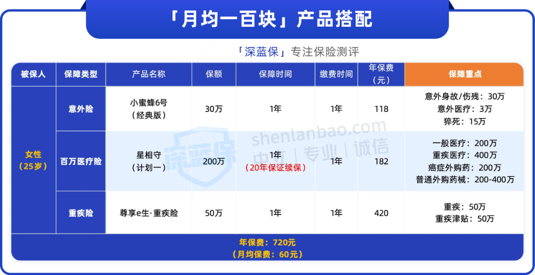 这样的搭配首年保费仅需720元,月均保费只需60块,很适合手头较紧张,或是刚毕业的朋友用来过渡。