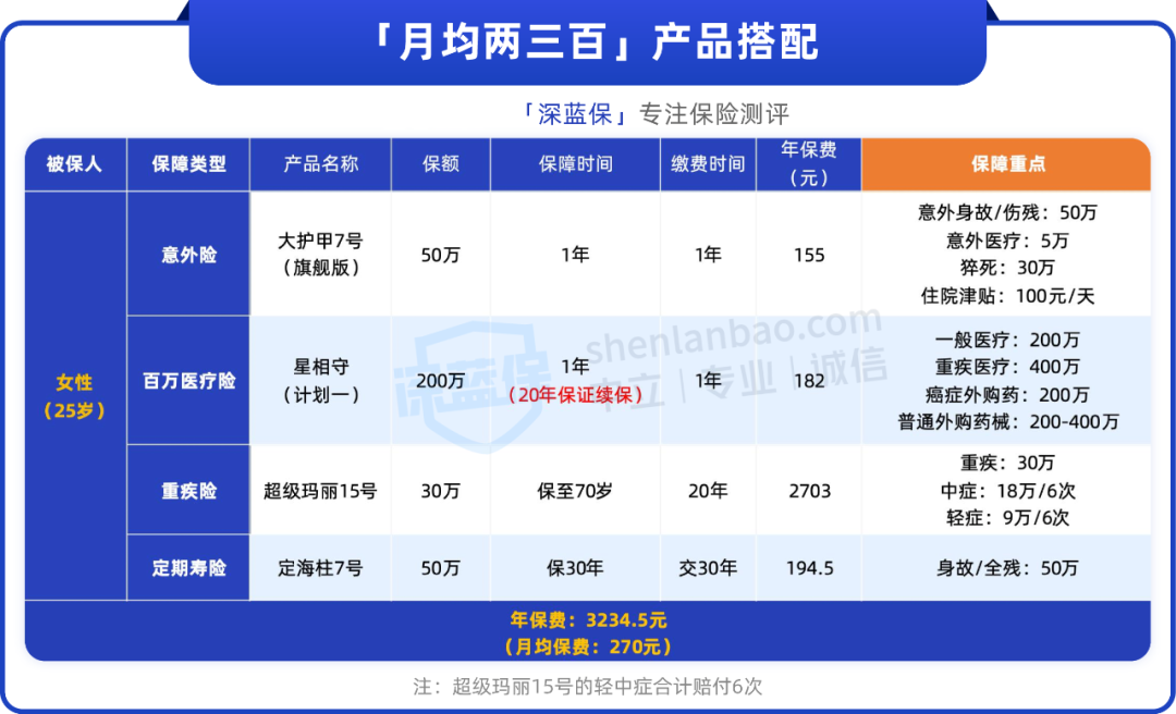 如果是25岁女性朋友投保这套方案,首年保费只需要3234.5元,月均270元,每月少买一两套游戏皮肤、少下两次馆子就能攒出保费了。