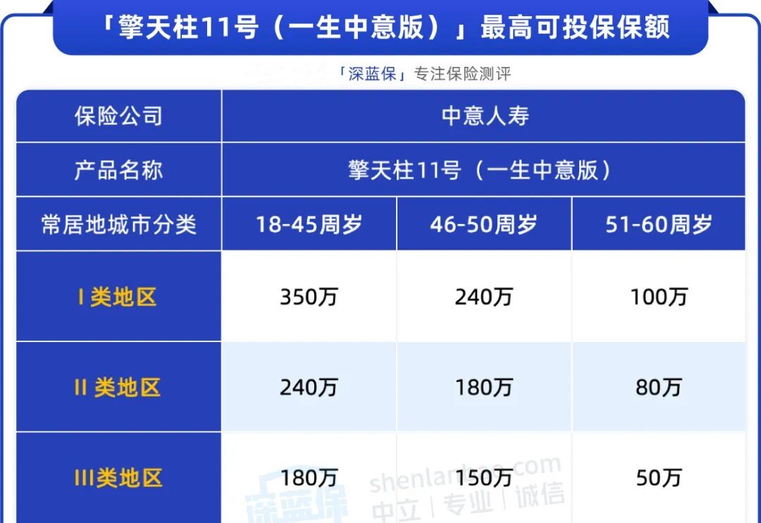 擎天柱11号(一生中意版)的最高可投保保额,主要跟被保人年龄和常居住地有关: