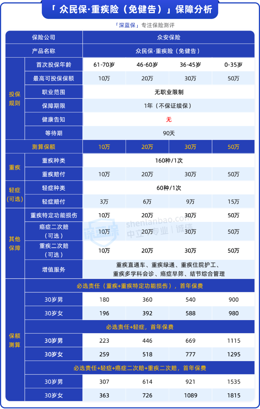 从整体来看,众民保·重疾险保障内容简单,不用健康告知,投保门槛宽松,适合当下身体情况有异常的朋友入手。