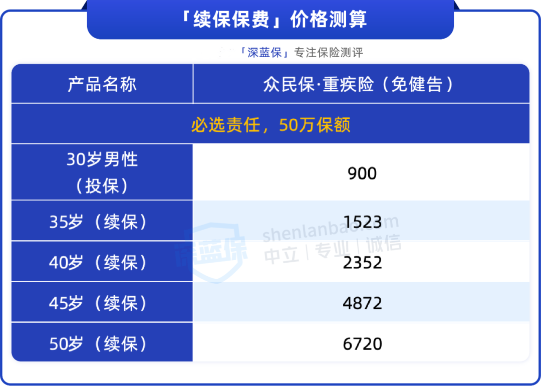 另外还要注意的是,不像其他的重疾险每年保费相同,众民保每年续保保费会随着年龄增加。