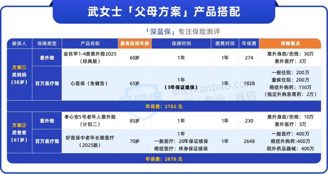 根据武女士爸妈的情况,我们筛选了大量的产品,最终设计了性价比很高的方案。