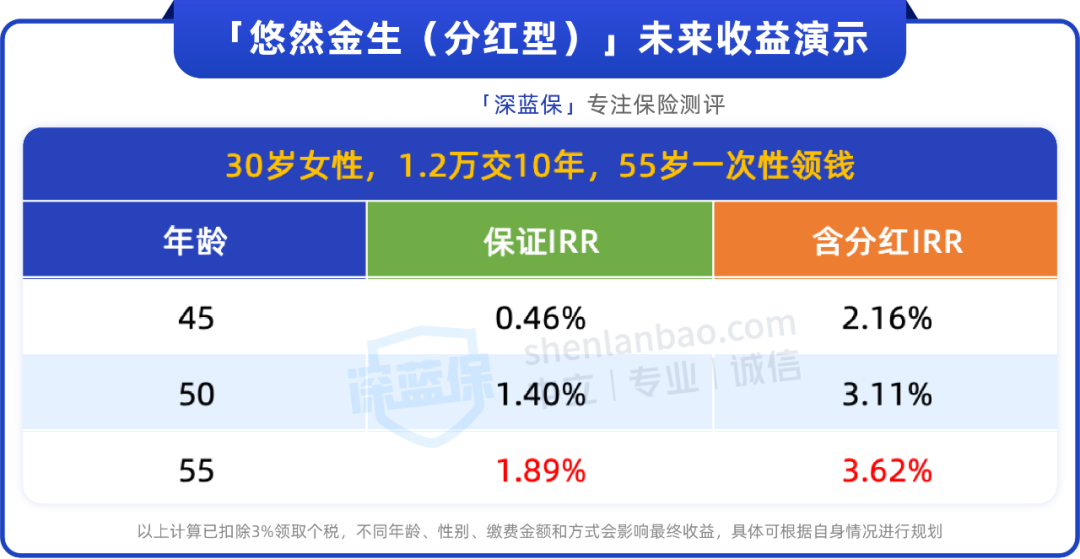 到55岁退休时,能保证拿到14.6万,算上分红能拿到20.8万,IRR高达3.62%: