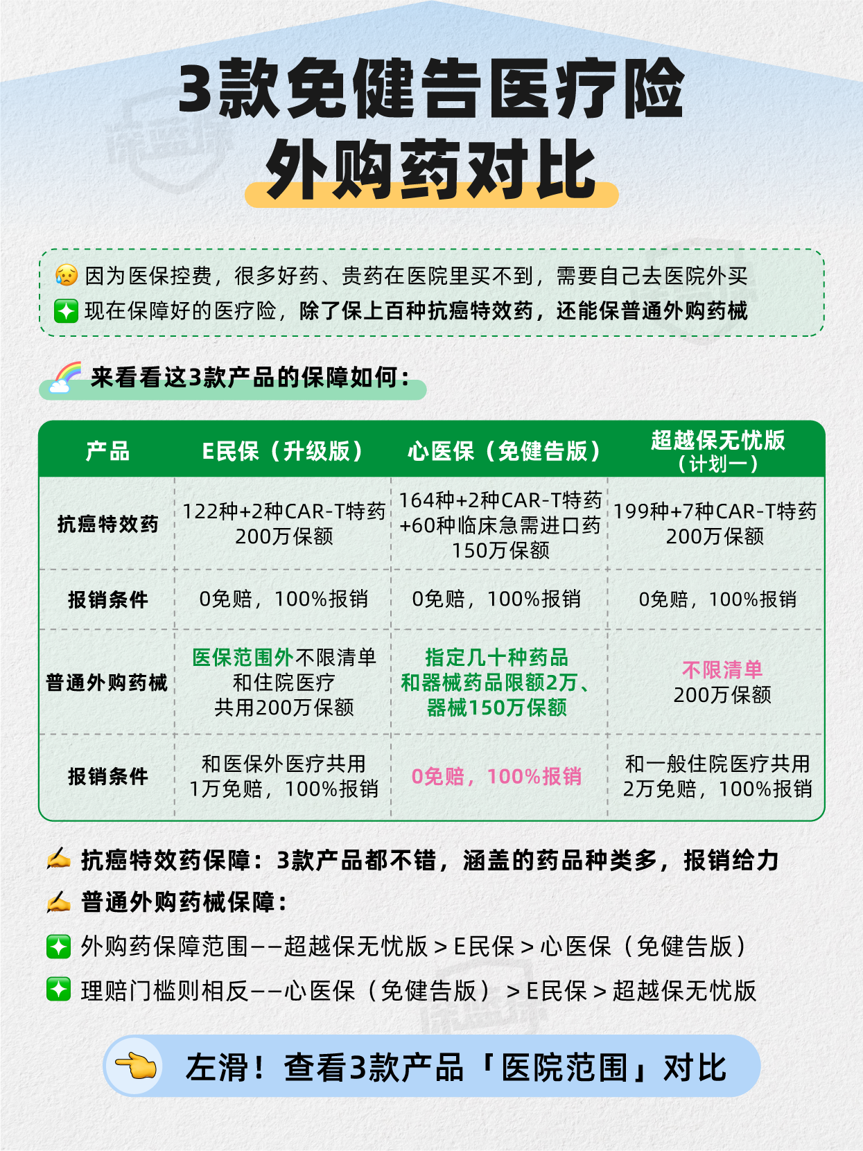 从基础保障、外购药、医院范围、既往症、价格等,来做个详细对比,大家看完,就能大致了解哪款产品更适合。