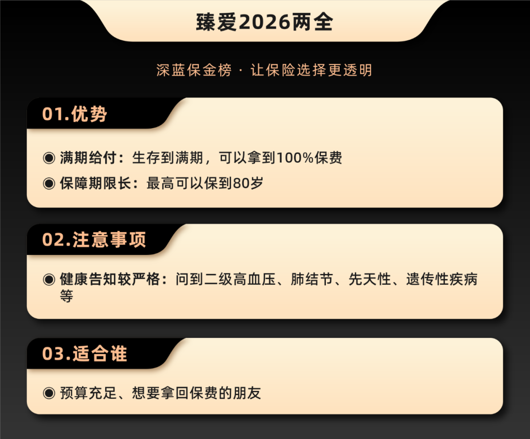 2、新增臻爱2026两全险,满期可以给付100%保费