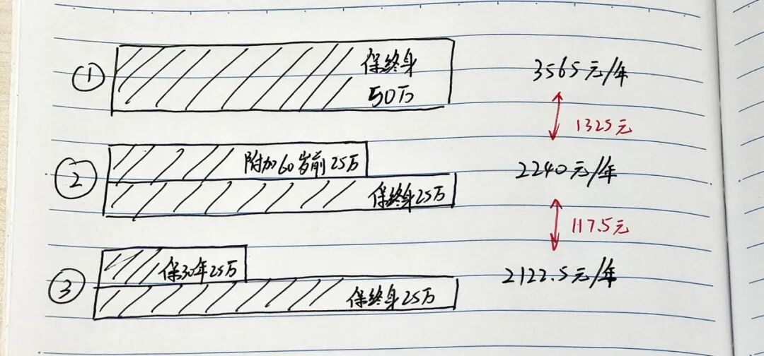 我自己算了下,25万基本保额,“附加60岁前”和“多一份保30年的”,每年保费就差1百多,但直接就能多保30年。理赔时不用跑两家,一步到位也方便点。