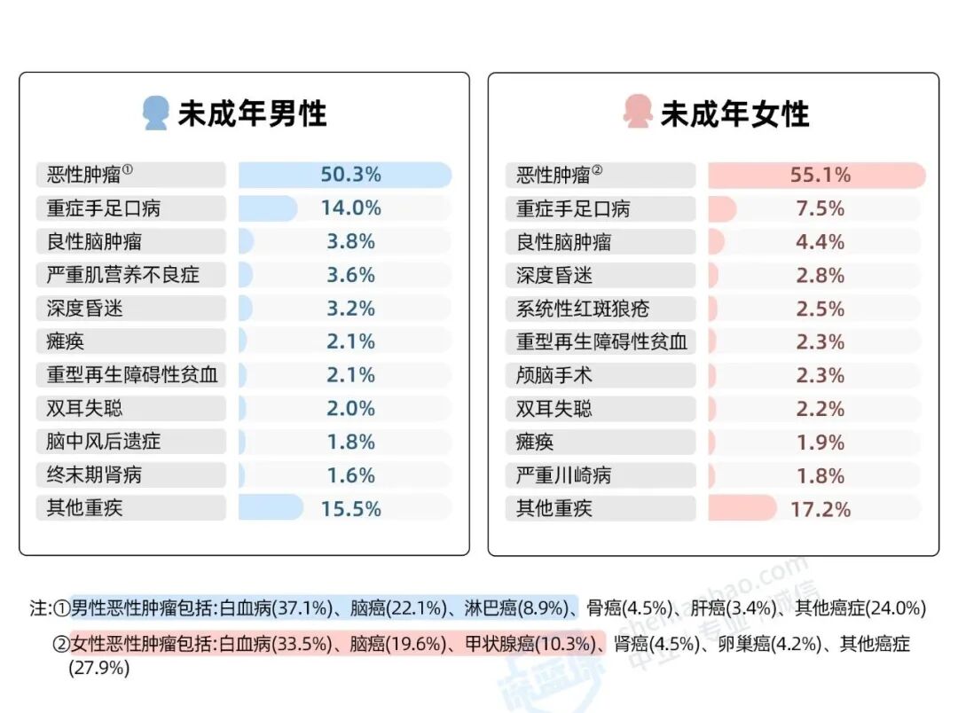 家里亲戚长辈也没啥家族病、遗传病,那就看看概率吧:重疾里超50%是恶性肿瘤,其中男孩最高发的是白血病,其次是脑癌和淋巴癌。