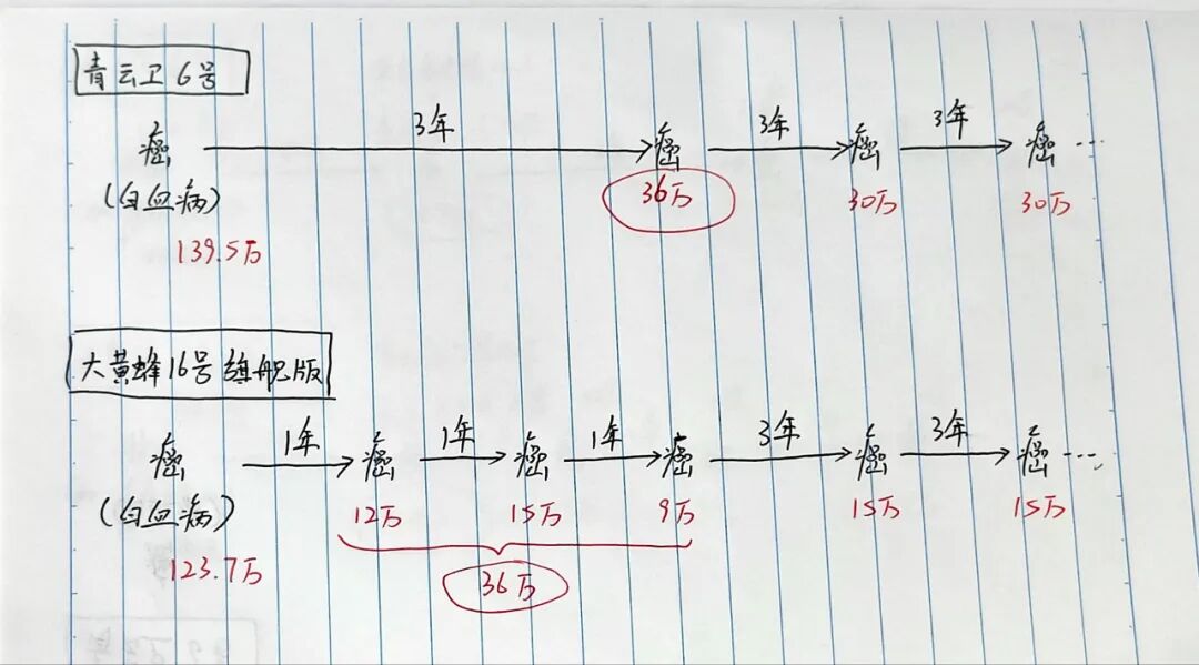 当时画完这个图,我就有种“我悟了”的感觉:其实这两种赔付方式,就是前3年不同嘛,那不就是看,第一笔赔的钱,到底能撑多久?