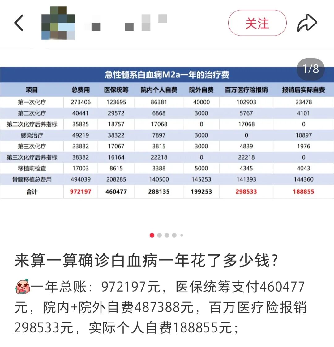 又搜了下网友的账单分享,化疗+骨髓移植,医保+百万医疗险报销完,真正自费的钱,不到20万。问了下自己的医生朋友,说也差不多这个数。