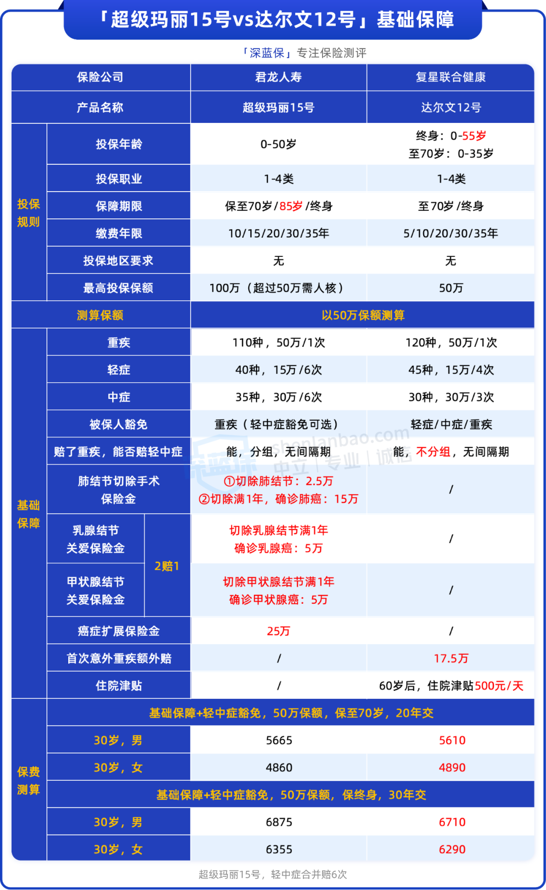 两款产品基础保障都很扎实,我们以50万保额为例,重点来对比细节的差异: