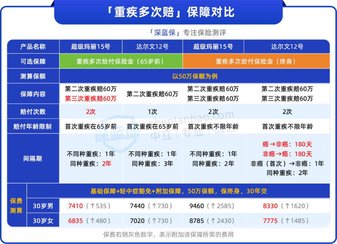 如果预算充足,希望终身都有多次重疾保障,可以考虑达尔文12号,保终身价格更便宜,癌症和其他重疾的间隔期比较短。