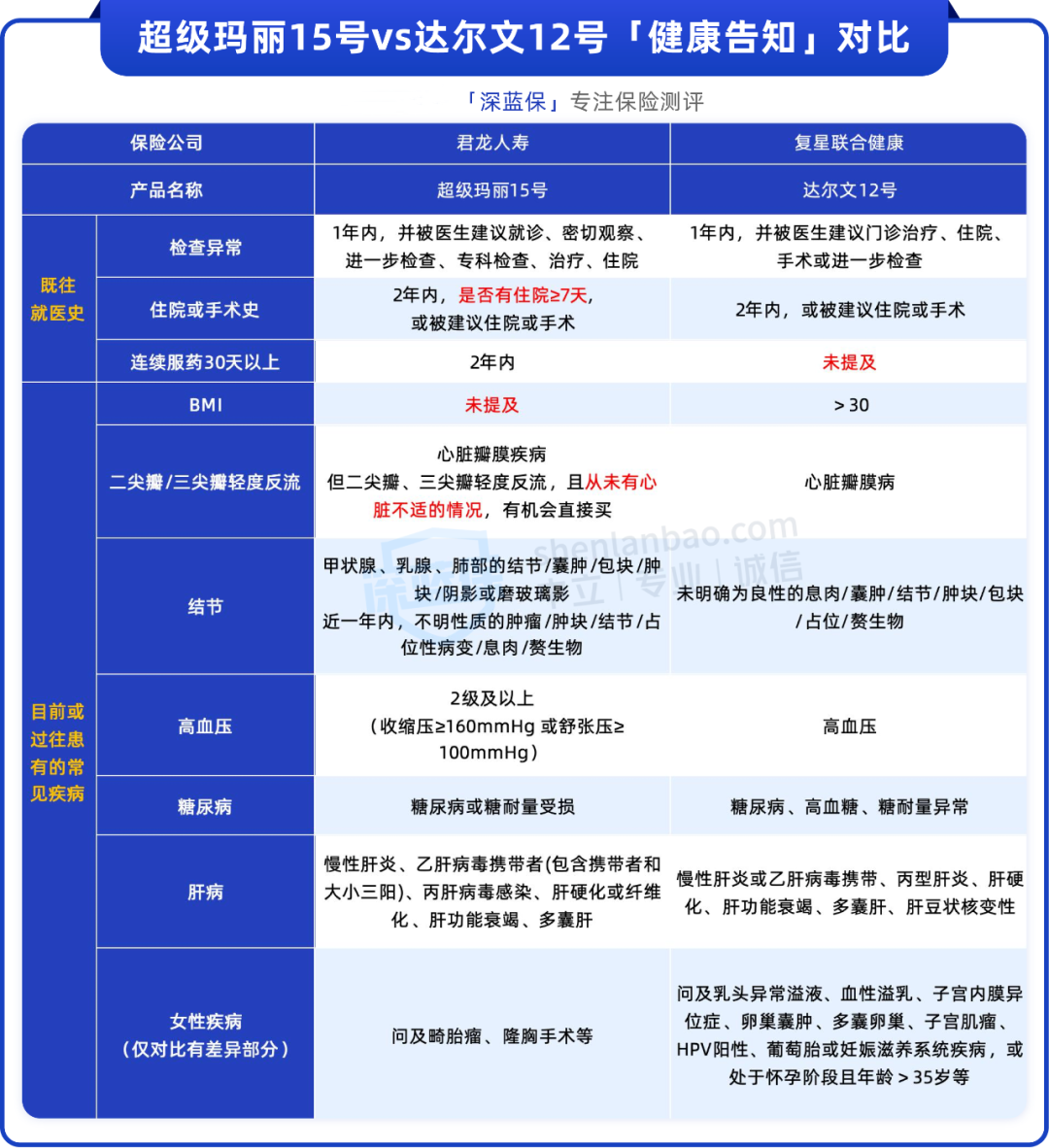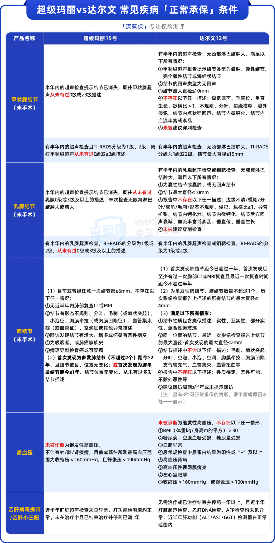从表格中可以看到,两款产品对“正常承保”的细节要求不同: