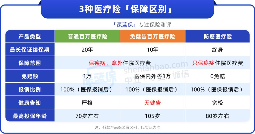 结合表格可以看到,这几种医疗险最大的区别是保障范围,百万医疗险和免健告医疗险不管啥病住院的医疗费都能保,防癌医疗险只保癌症住院费用。