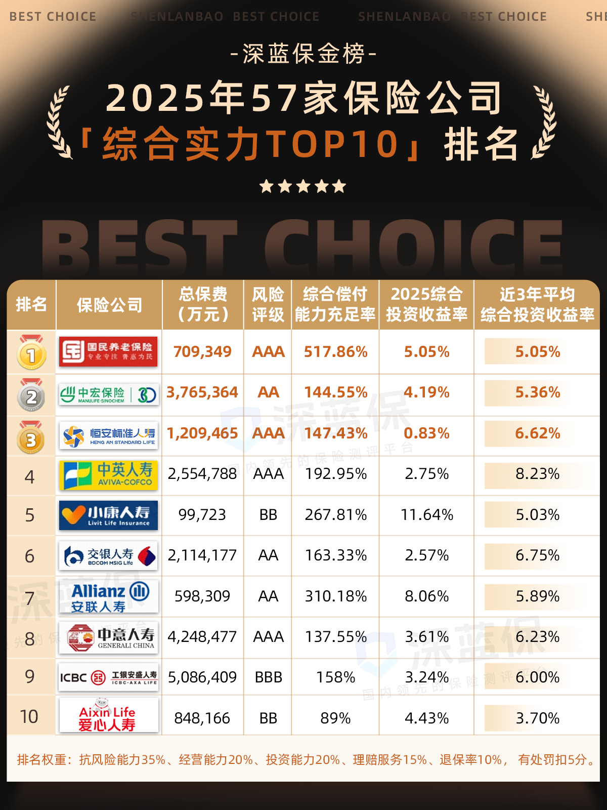 结合5大维度,前十名分别是:国民养老、中宏人寿、恒安标准人寿、中英人寿、小康人寿、交银人寿、安联人寿、中意人寿、工银安盛、爱心人寿。