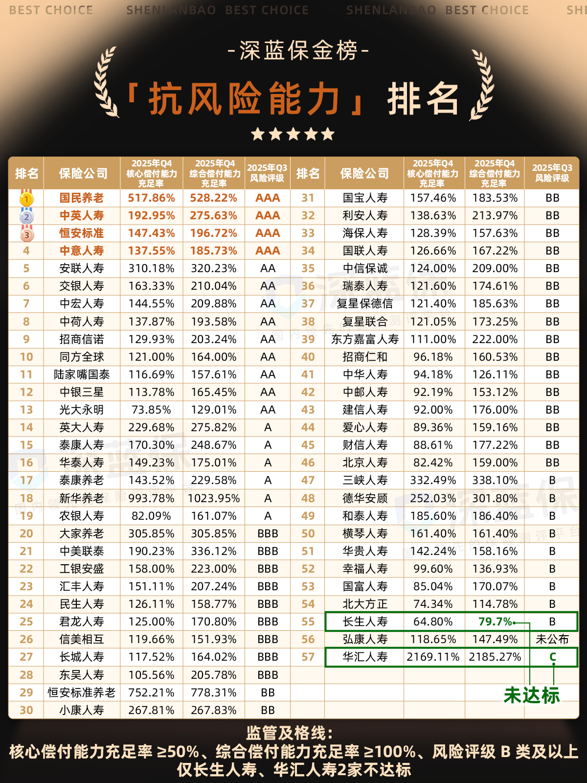 57家里,长生人寿偿付能力不达标,华汇人寿风险评级为C,这两家多留个心眼。