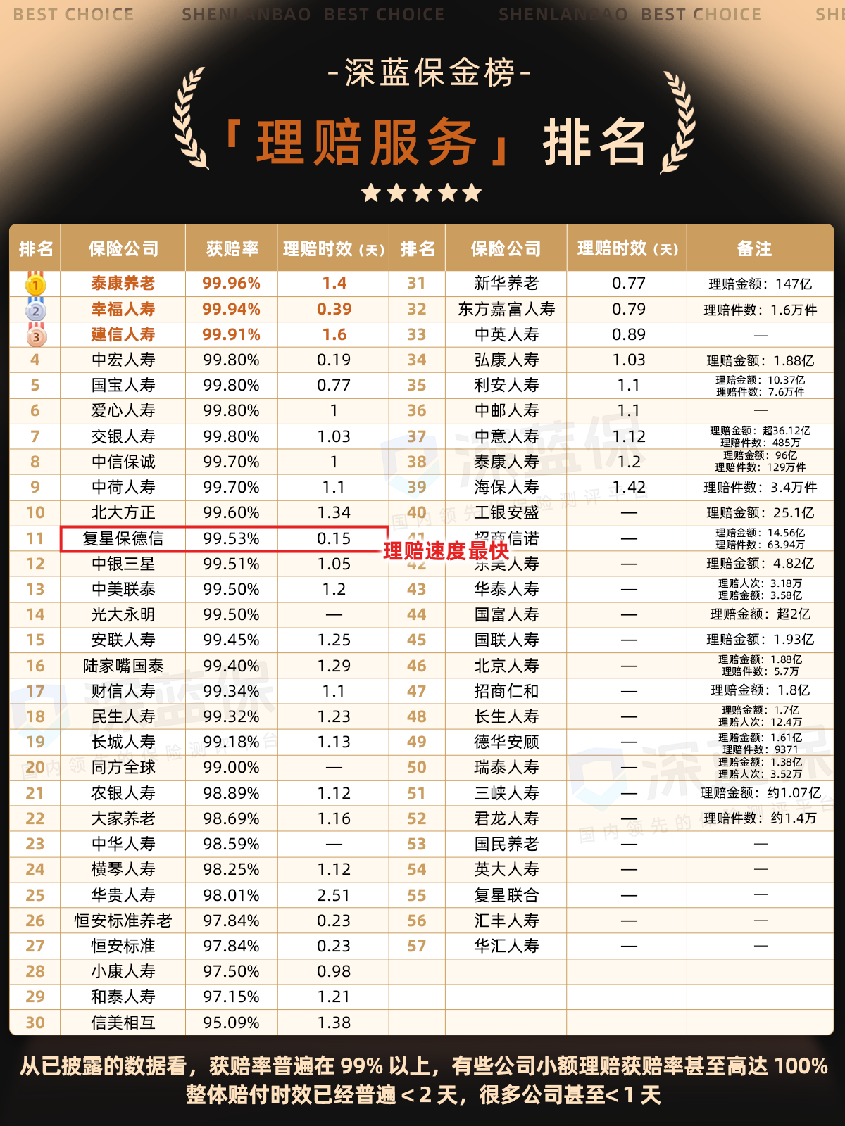 行业获赔率普遍99%以上,不到2天就能完成理赔,复星保德信理赔速度最快,只用0.15天。