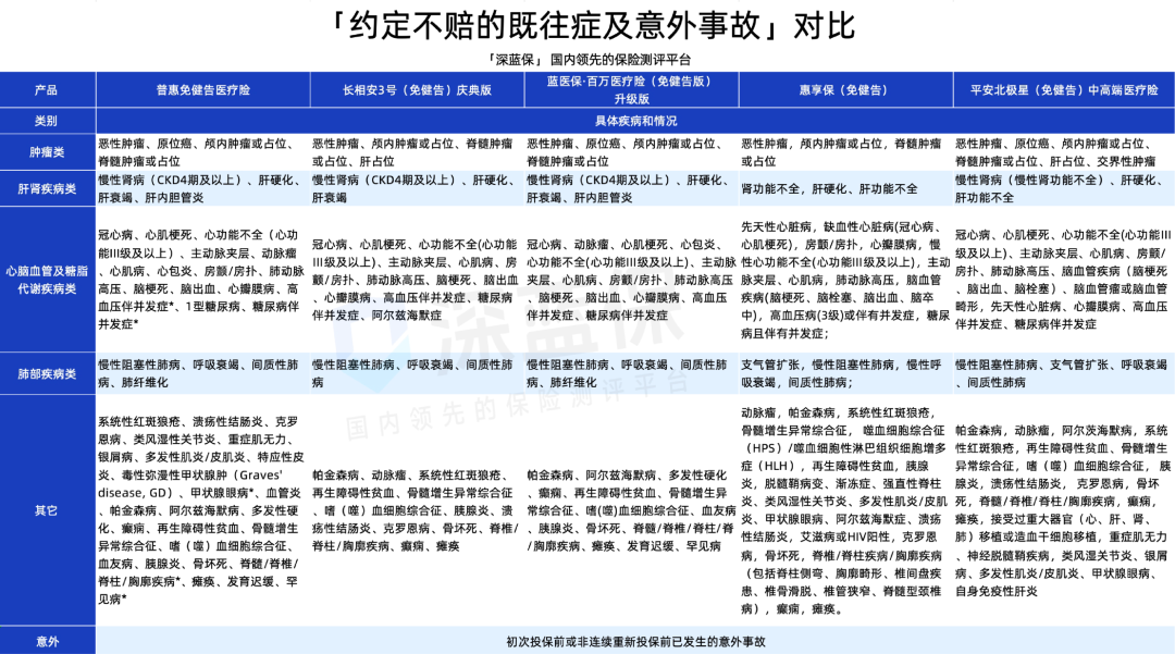 另外要提醒大家,这5款产品都承诺一般既往症可赔付,仅对5大类严重既往症及其并发症免责,不过不同产品约定的免责疾病范围有区别,具体如下: