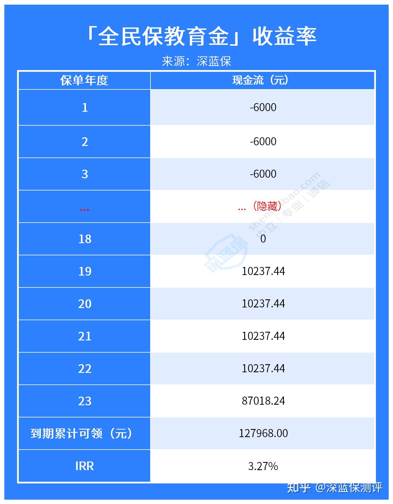 通过测算得知,全民保教育金的收益率大概为3.27%左右,总体的收益还算比较可观。