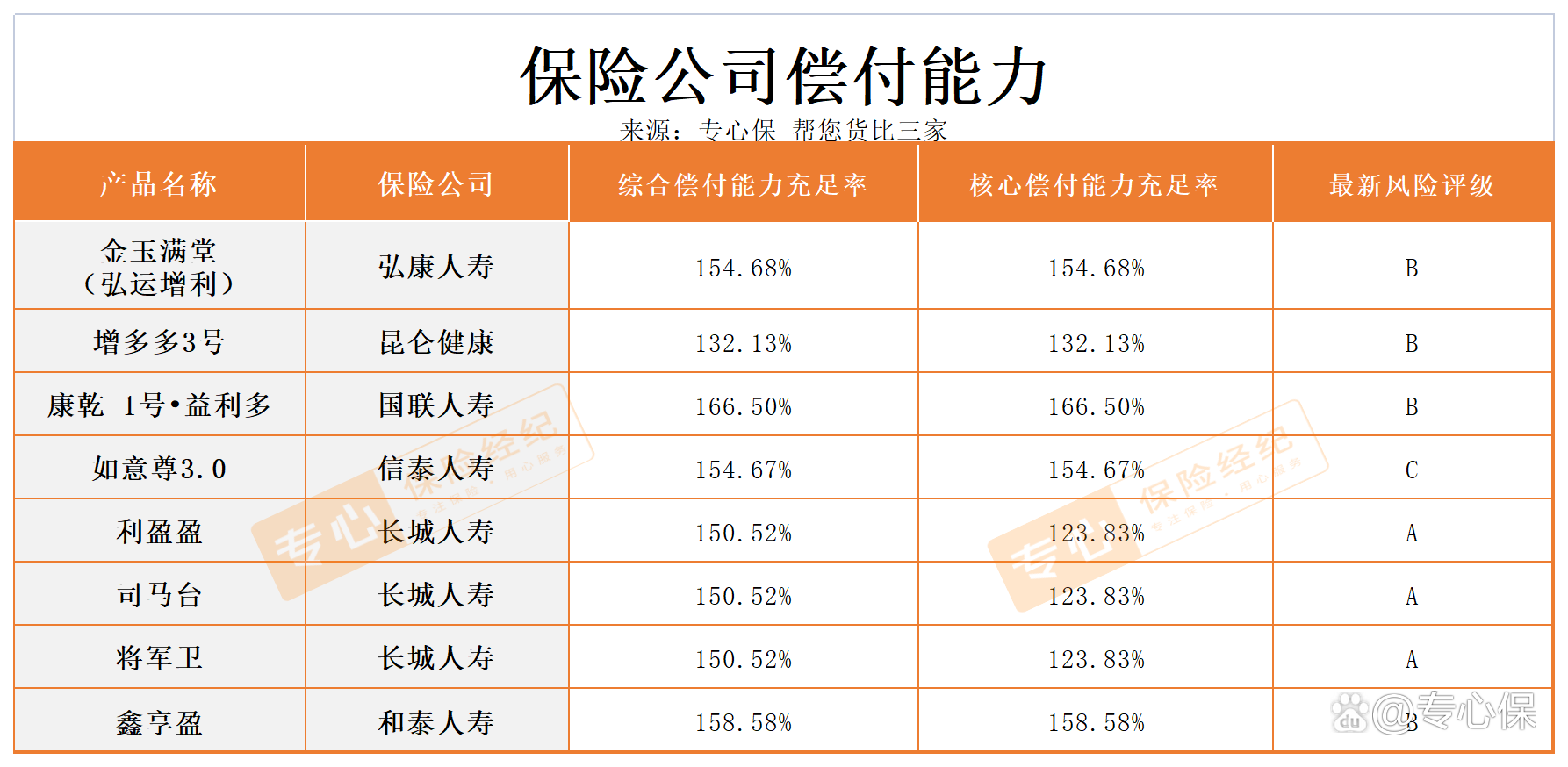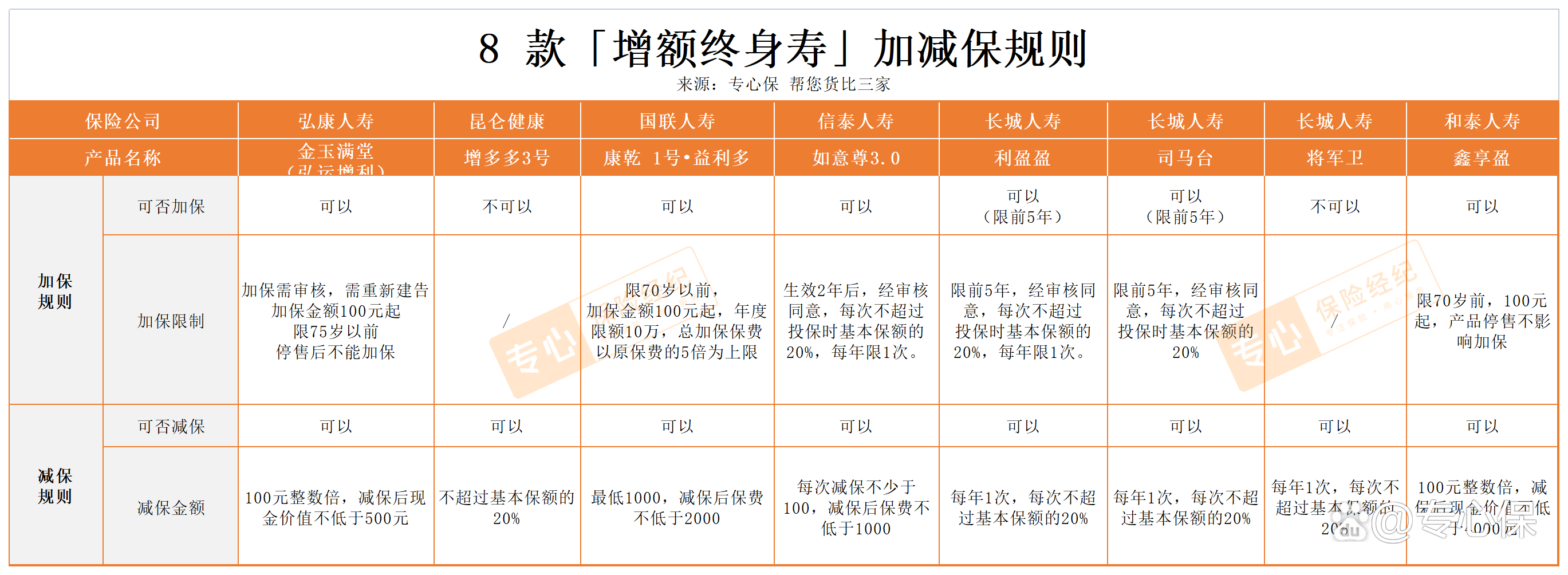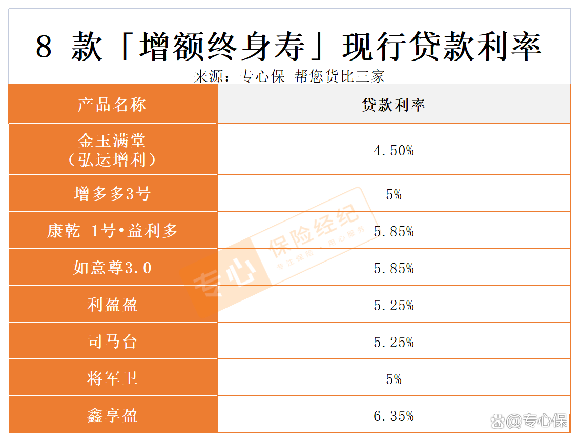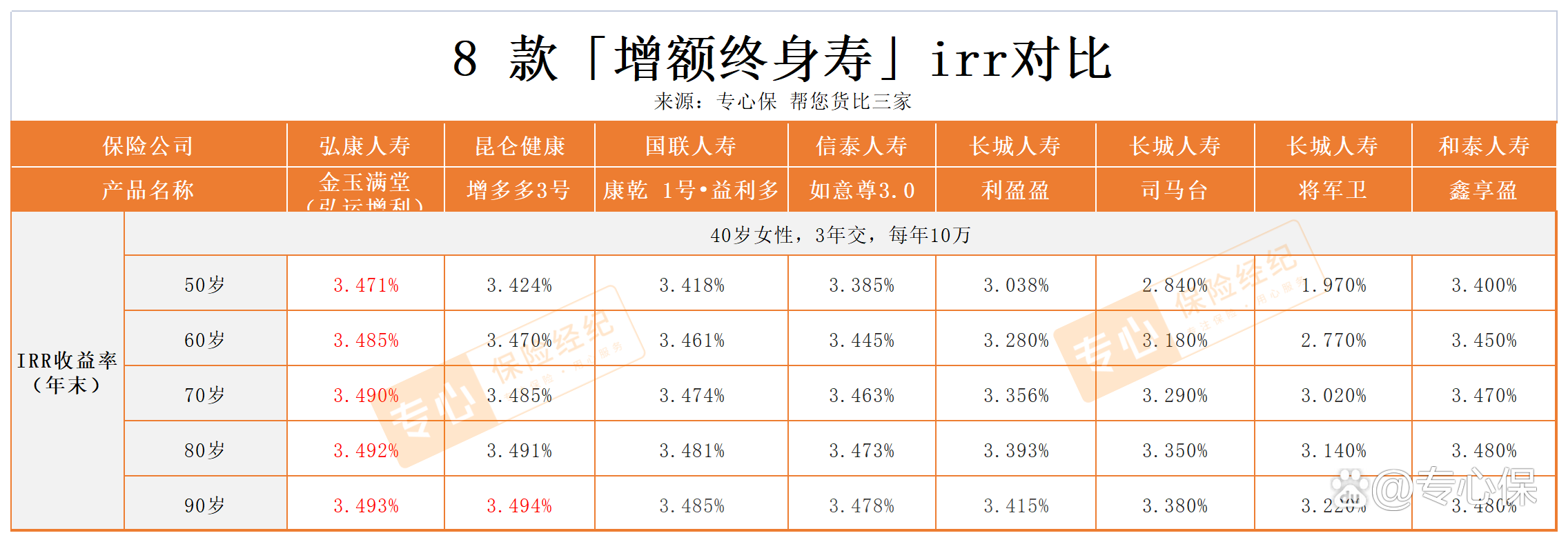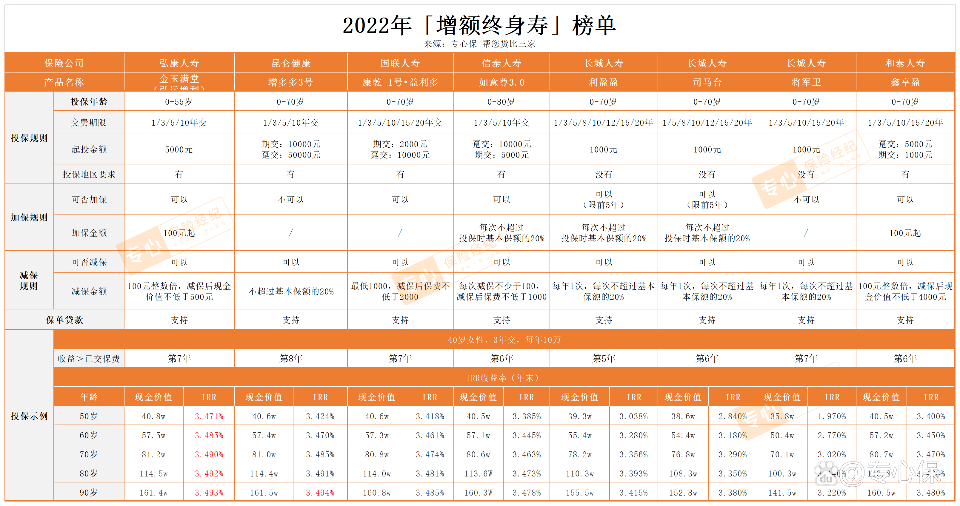 以40岁女性,3年交,每年交10万为例。 这么一对比,不用我多说,大家也能看出来了。 金玉满堂展现出了绝对的优势。 虽然在前面的对比中,金玉满堂现金价值超过保费的时间相对晚一点,第7年才开始产生收益。 但是从第8年开始,越往后,irr表现越来越优异,在不同的年份,收益都排在第一梯队。 虽然到了很后期,有被增多多3号这样的产品超过,但是总体来看,金玉满堂的优势十分突出。 毕竟人的寿命有限,重点要关注50~80岁之间这段时间的收益表现。 2、灵不灵活 看完收益,增额终身寿的灵活性也是我们要重点考虑的点。 它的灵活性体现在3个方面:加保、减保、保单贷款。 加保主要是方便中途如果有闲钱,还可以往账户里面加钱。 目前还是有挺多产品支持加保,不过会在合同中写明需要经过保险公司审核同意。 比如金玉满堂、长城人寿的利盈盈、司马台,如意尊3.0、益利多、鑫享盈等。 和泰鑫享盈终身寿险条款截图 减保的灵活性,影响的则是我们如何使用这笔钱。 说白了,就有点类似于取钱的意思,只不过取的是账户里的现金价值。 对于减保,大部分保司都相对宽松,会直接写明减保规则。 金玉满堂增额终身寿险条款截图 不管是加保还是减保,不管用不得上,肯定是都支持是比较好的,再就是限制越少越好。 其次,在减保金额上面,以现金价值作为限额维度的,会更胜一筹。 因为增额终身寿这类产品,越往后,现金价值超过保额和保费的空间越多,这意味着能提前取出来的部分更高。 我仔细盘了下这8款产品的加减保规则: 按照上面的逻辑,可以得出结论: 第一名:和泰鑫享盈,加保减保都灵活。 尤其是加保,只要是在70岁前,不限制频次,100块钱起加,即使是产品停售了,也不影响加保。 减保也是,只要求减保后现金价值不低于4000元就行。 第二名:金玉满堂,减保尤其灵活。 虽然加保方面限制相对多一点,不过年龄限制比鑫享盈宽松一点,75岁前都可以加保,比较遗憾的是产品停售后不能加保,所以考虑这款产品的,一定提前想好起投金额,弘康人寿已经下发了通知,9月30号产品就下架了。 在减保方面,金玉满堂表现最好,规定减保后,现金价值≥500元,就可以了,500元,已经无限接近全额取出了。 第三名:支持加减保,但是限制较多 长城人寿的司马台、利盈盈,如意尊3.0,康乾1号益利多都属于这一梯队。 加保限制了时间、频次,减保要么以保费要么以保额为限额。灵活性稍微差一点。 第四名:不支持加保,减保限制多 增多多3号和将军卫,都不支持加保,减保表现也不算优异,这一轮比拼暂居尾部。 我们再看看保单贷款,保单贷款主要可以用来应急,短时间内需要用钱,但又不想影响后续加保和现金价值,就可以用保单贷款救急。 这几款产品都支持,可以贷出现金价值的80%,我们重点看贷款利率。 贷款利率越低,意味着贷款要还的利息越少。 这么一比较下来,金玉满堂一不小心又抢了个第一,只有4.5%。其他也有在5%左右的,但是别小看了这零点几的差距。 我给大家举个例子就明白了。 #举个“栗子”# 30岁的老李,投保金玉满堂,5年交,每年交10万。 等他50岁的时候,生意上需要急用一笔钱,就用保单贷款形式贷了50万,约定一年后还款。 一年后,除了已支付保费,老李需要还22500的利息。 而在这一年中,保单账户里的钱在继续增值,增值了32400元。增值的钱比要还的利息还要高出一万左右,相当于免费拿保险公司这笔钱做了下资金周转。 如果贷款利率到5.25%,利息就要多掏3750,有这三千多块钱,干点啥不香呢。 所以,贷款利率这一块,金玉满堂又赢了一局。 3、保司表现如何? 虽然我在之前的文章中,反复强调能称之为保险公司的,都没有小公司这一说。 不过还是有很多人会把保险公司大小当做考虑的维度。 也能理解,毕竟是大几十万的钱投进去,总是要更谨慎一点。 但是我们评估保险公司的实力,不是看有没有听说过,有没有在广告上看到过。 核心在于保险公司的偿付能力,也就是兑付保单的能力。 保险公司的偿付能力分为3个方面:综合偿付能力充足率、核心偿付能力充足率、风险评级。 银保监会的硬性要求是:综合偿付能力充足率≥100%、核心偿付能力充足率≥50%、风险评级在B级以上。 这8款产品背后的保险公司,都达到了相关标准,只有信泰人寿的风险评级为C。 不过这些保司的偿付能力都在120%以上,所以几乎不用担心。 看到这里,重点的几个维度就已经讲完了,我们简单复盘下做个总结: 收益高,IRR接近3.5%:金玉满堂、增多多3号、鑫享盈。 加减保灵活,表现优异:鑫享盈、金玉满堂。 保单贷款利率低:金玉满堂。 综合来看,金玉满堂表现略胜一筹,几乎在每个维度都能排在前列。 这里再提醒一句,金玉满堂在9月30日要正式下架了。 更多产品详情,可以点击下方小程序,预约一名规划师为你详细讲解: