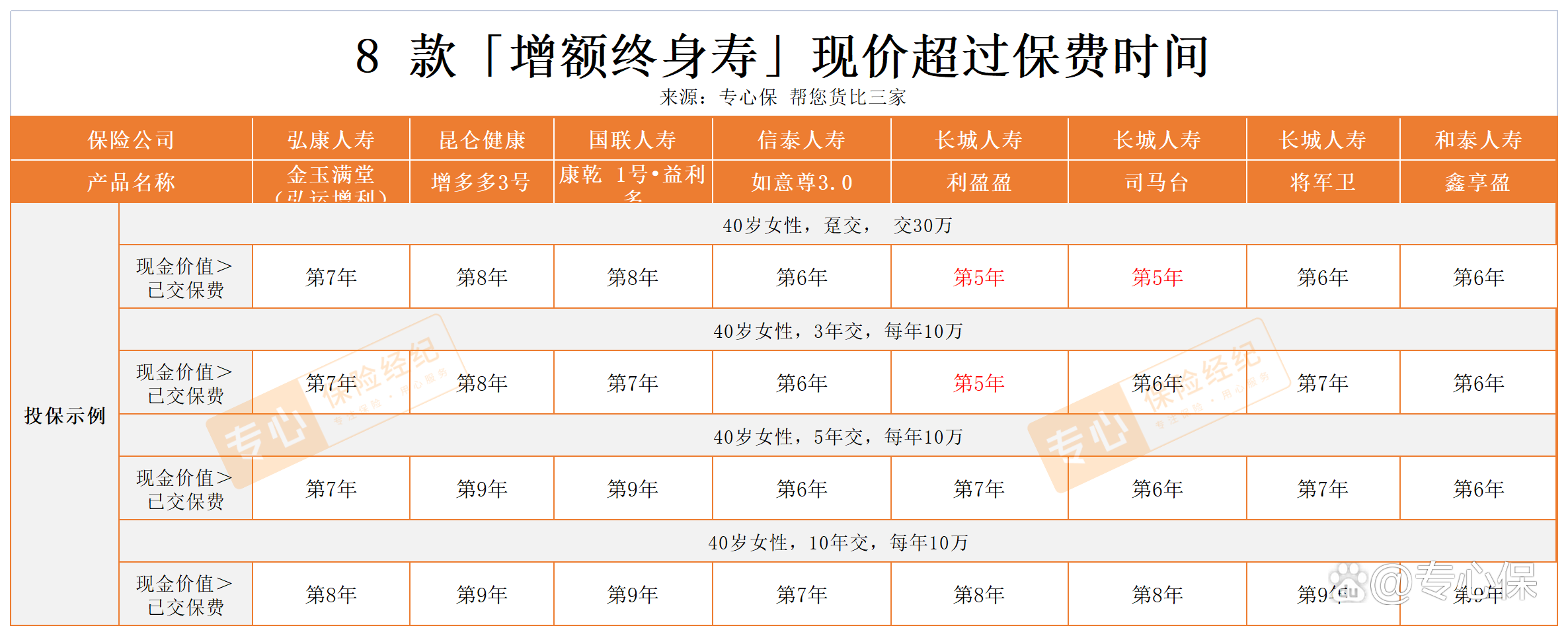 最近,增额终身寿有多火呢? 大概就是朋友圈做投资的、保险的、银行的几乎都在推它。 细想下来也能理解,近几年,疫情肆虐、股市低迷、银行利率下行。 大家都在想办法保住自己的钱袋子。 安全稳健、长期回报率高、还能兼顾灵活性。 凭着这几大优势,增额终身寿会火也不奇怪了。 这段时间,我也盘了盘目前线上卖得比较火的增额终身寿产品。 整理出了8月的增额终身寿榜单。 增额终身寿产品相对简单,不像重疾险、医疗险那样保障很复杂。 怎么买,买多少,能拿回多少,白纸黑字都写在合同里。 我们衡量一款增额终身寿到底好不好,无非就是从:收益高不高、灵不灵活、公司怎么样、是否有特色服务这几个方面来考量。 按照这样的维度,我从市面上众多的产品中筛选了8款表现比较好的。 接下来,我们再看看这8款增额终身寿具体表现如何。 1、收益高不高 先看最核心的部分,收益怎么样。 主要看两个方面,一个是看现金价值,另一个就是irr。 先看现金价值。 现金价值,其实就是我们自己的钱,只不过是固定在保单里,简单点理解,就是退保或减保时,我们能拿回来的钱。 这密切关系到我们活着的时候能怎么用这笔钱。这里就会涉及到一个时间问题。 当现金价值开始超过我们投入的保费的时候,就意味着我们投入的这笔钱开始有收益了,有点类似于我们投资讲的保单现金价值超过已支付保费。 这个“保单现金价值超过已支付保费”的时间越短,就意味着能越早操作退保不会亏钱。 我选取了比较常见的趸交、3年交、5年交、10年交的方式,以40岁女性为例,测算了下8款产品现金价值超过保费的时间。 对比下来可以看到,表现比较优异的有长城人寿的利盈盈、司马台,和泰人寿的鑫享盈,以及信泰人寿的如意尊3.0。 但是,我们不能单看这一点,毕竟我们买增额终身寿目的是为了让它长期稳定增值的,不到万不得已的时候前期也不会取出来。 所以,我们还要看长期的irr表现如何,这个才是更重要的关注点。 irr讲的是内部收益率,就是资金流入现值总额与资金流出现值总额相等、净现值等于零时的折现率。 通常我们用它来衡量一款长期现金流的收益表现。 它跟银行存款、国债这些不一样,后两者都是算单利,而irr看的是复利,也就是利滚利。 这里就不扯远去讲概念了,只要记住一点,irr越高,长期收益表现越好。 如果想要了解更详细的计算方法的,也不用自己去背概念算公式,点击下方小程序直接预约保险顾问,可以一对一咨询。一、测评:8款增额终身寿,谁更好?