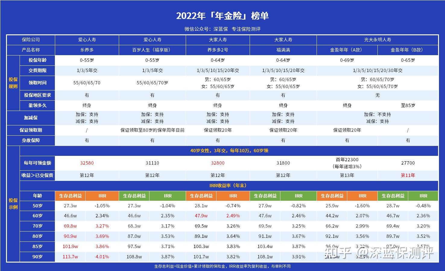 深蓝君对比了几十款养老年金,选出了几款比较值得购买的,做成以下表格: