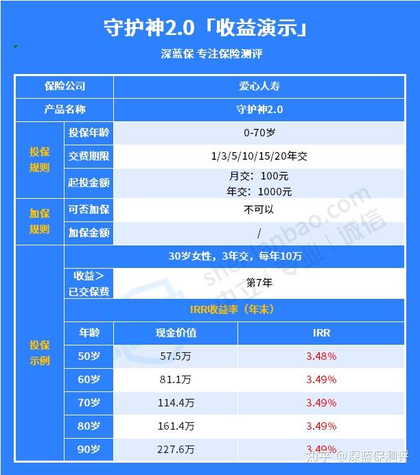 增额终身寿险也是一样的,以守护神2.0为例,以30岁男性,年交10万,交3年为投保条件,我们看它的现金价值表: