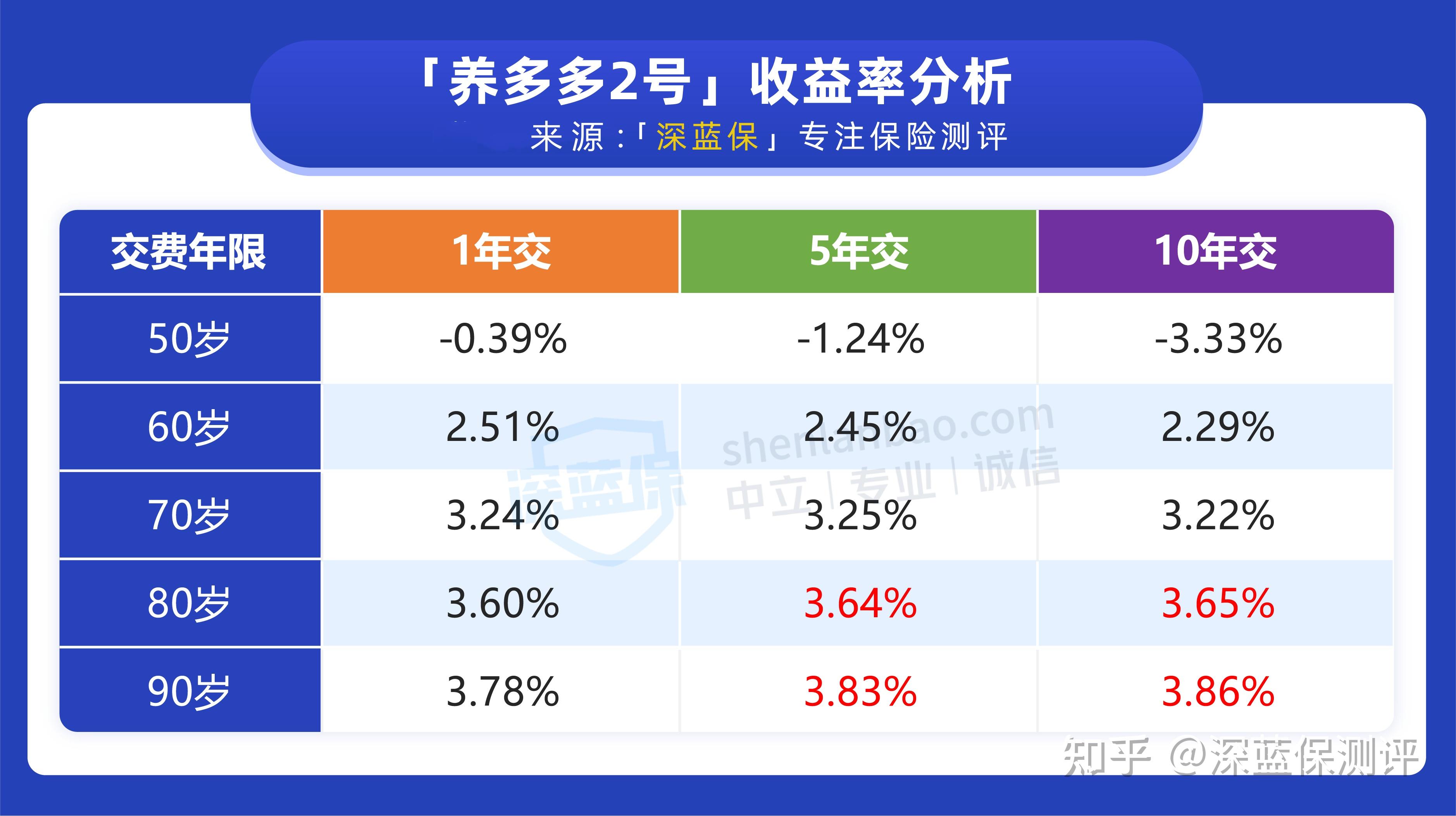 无论是 1 年交还是 5 年交,接近 90 岁时,它的收益率都能超过养多多 2 号,其中 5 年交收益率最高,在 90 岁能达到 3.88%,可以优先考虑。