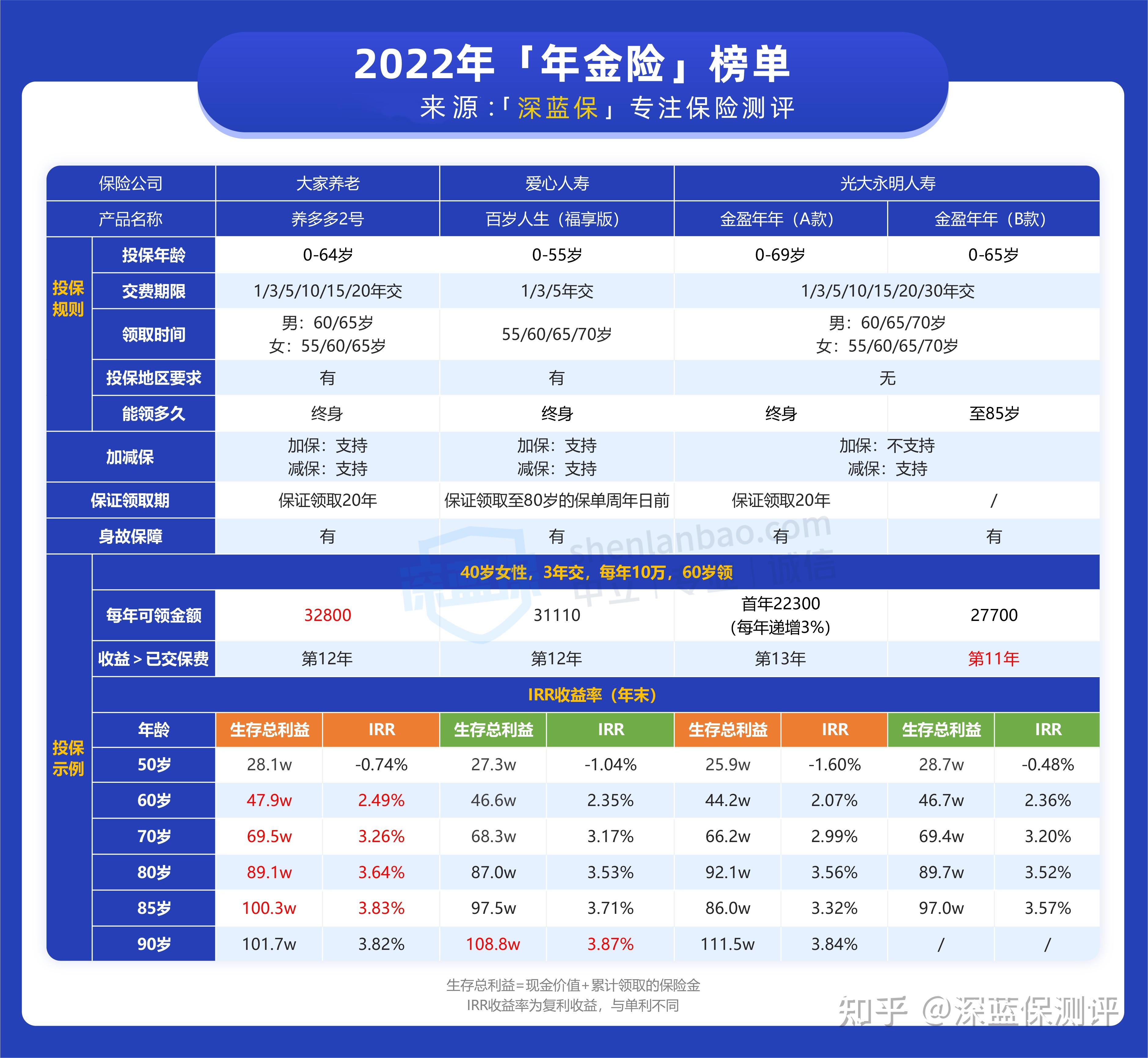 以“40 岁女性,3 年交,每年 10 万,60 岁领”为例,60 岁时能领的钱是 2.2 万,到了 70 岁就可以领差不多 3 万,而到了 80 岁每年能领的钱超过了 4 万。