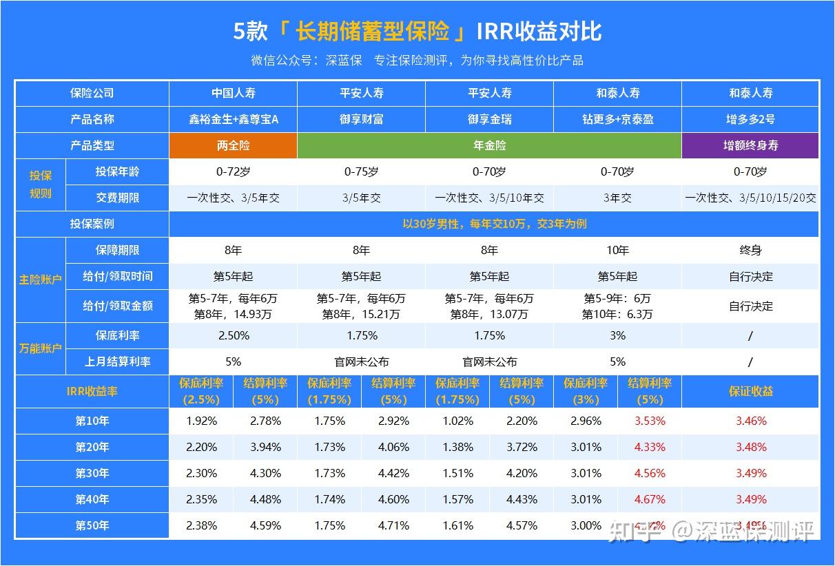 平安的养老保险种类非常之多,我搜集了市面上5款热门的长期储蓄型保险来进行对照,看看它们的IRR收益如何: