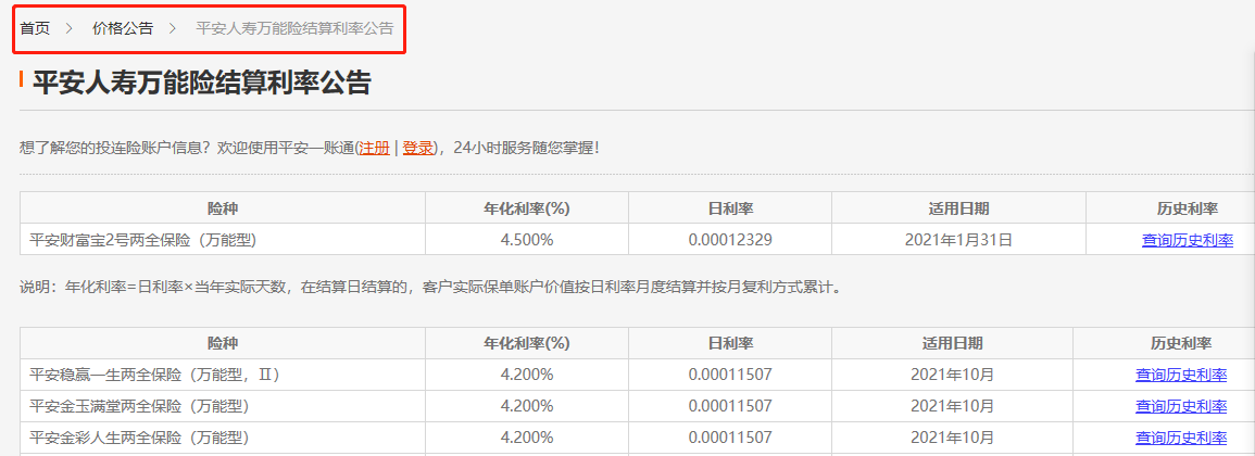 结算利率:是保险公司根据实际利率结算出来的收益,每月会在官网或官微公布;如平安人寿,在官网的首页——价格公告——万能险的结算利率公告就可以看到实际的结算利率,以及查询历史利率,不过这都不能代表我们以后能拿到手的收益率,超过保底利率的收益都是不确定的。