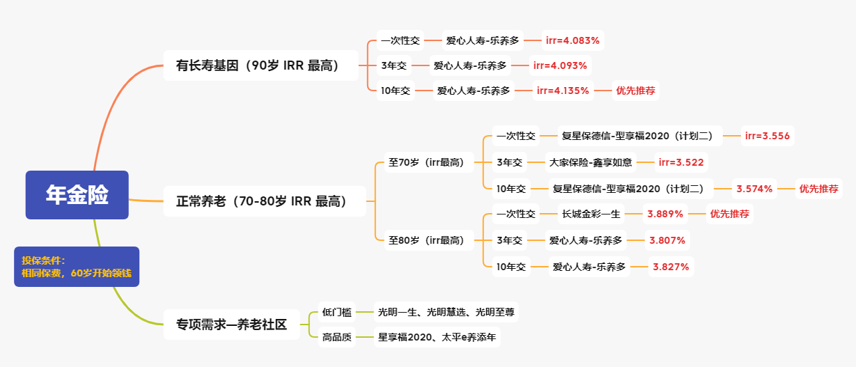 如上表所示,60岁irr最高的是京福颐年,70岁irr最高的是如意享(七金版),80岁irr最高的是养多多;所以大家可以结合用钱的时间去比较 irr 的高低。