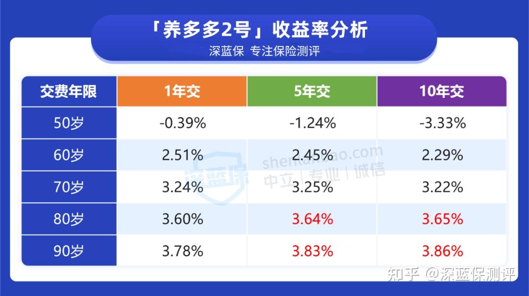 无论是 1 年交还是 5 年交,接近 90 岁时,它的收益率都能超过养多多 2 号,其中 5 年交收益率最高,在 90 岁能达到 3.88%,可以优先考虑。