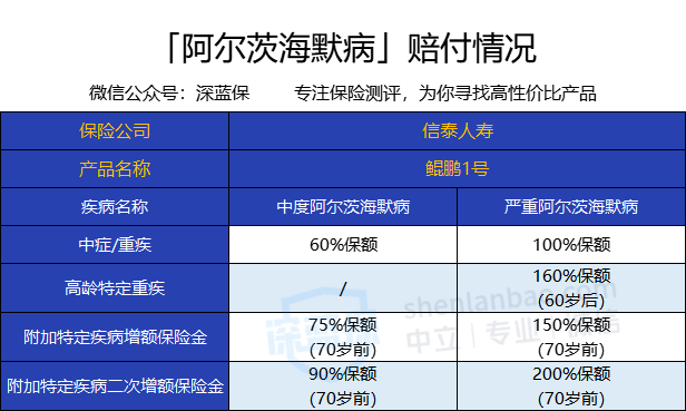 如果是严重阿尔茨海默病,可以获得100%保额的重疾保险金;如果恰巧是60岁后首次得严重阿尔茨海默病,一共能赔付160%保额。