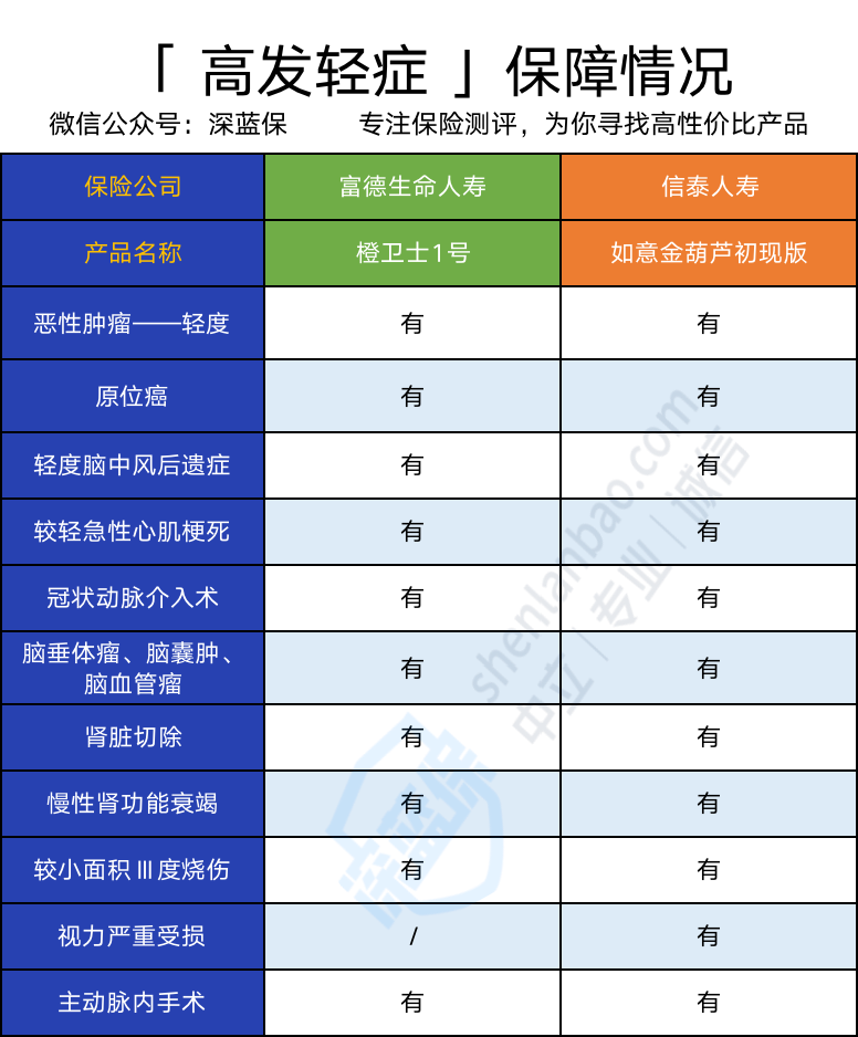 可以看到,如意金葫芦初现版的高发轻症保障更全面,而橙卫士1号缺乏了视力严重受损这一高发轻症,有一些遗憾。