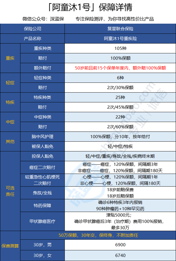 阿童沐1号是复星联合健康旗下的一款重疾险,其重疾最高赔200%保额,轻症最高赔45%保额,还有患甲状腺癌报销等责任,颇有特色。