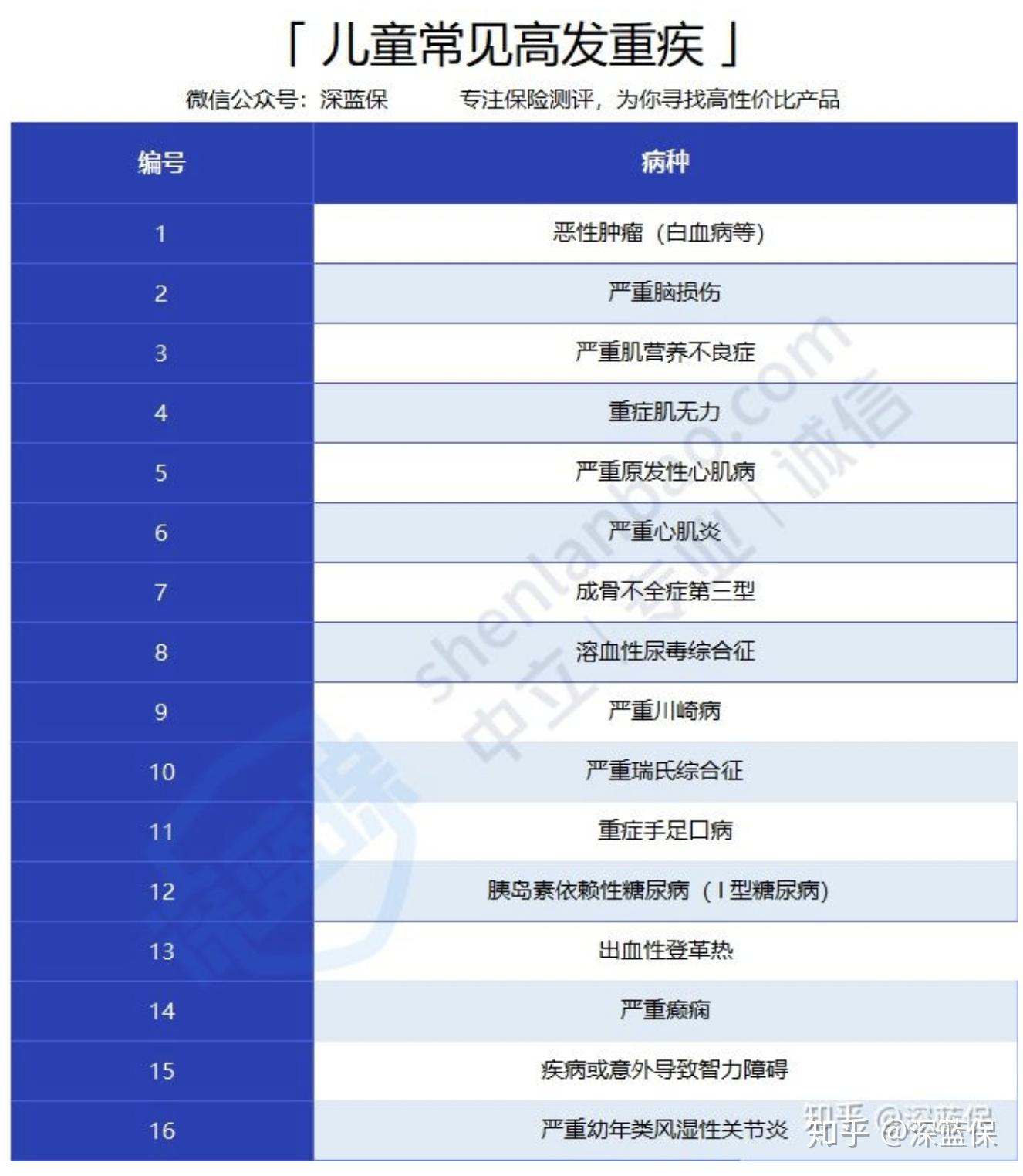 为了确定哪些是少儿高发重疾,我翻阅了市面上很多对儿童高发重疾的期刊,查了100多种重疾定义,最终确定了以下在儿童阶段发病率最高的16种少儿疾病: