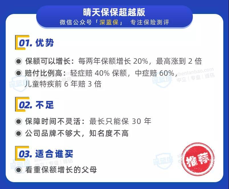 晴天保保超越版也是一款很不错的儿童重疾,它的优势和不足如下: