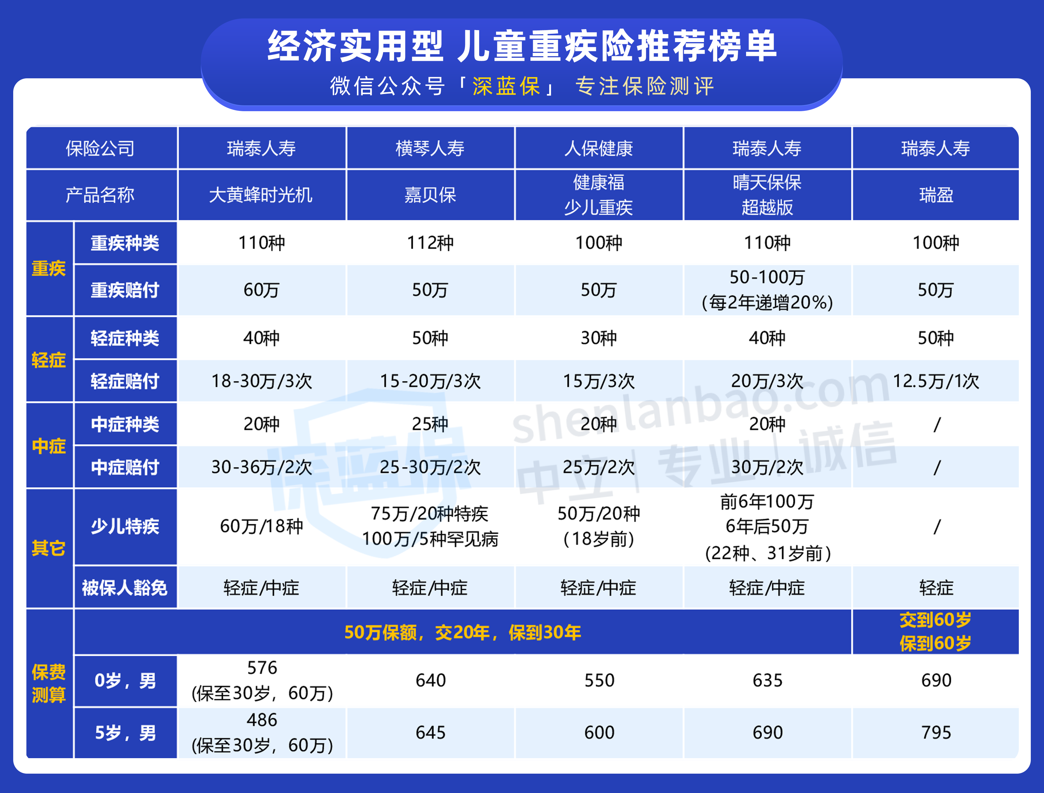 除去日常开销,很多家庭留给孩子买保险的钱并不多,于是,我们专门设置了经济实用型儿童重疾榜单:主要保障未来二三十年。