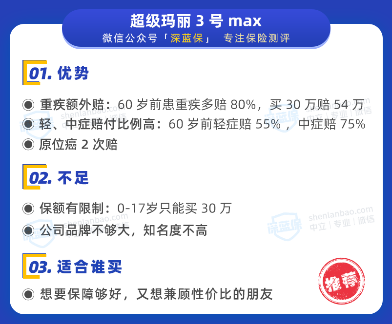 虽然超级玛丽 3 号 max 0 - 17 岁最高只能买 30 万,但 60 岁前重疾额外赔 80%,算下来也能赔到 54 万。