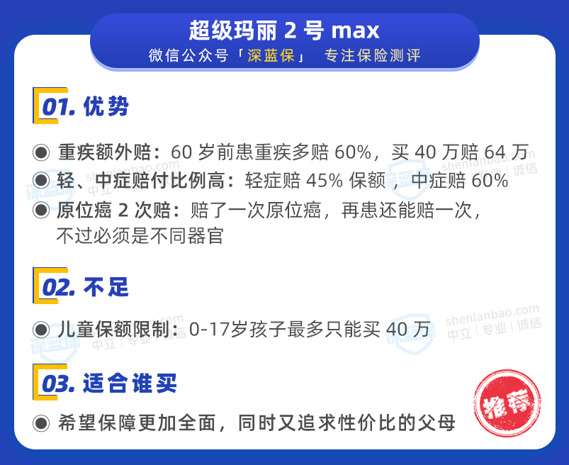 需要注意,超级玛丽 2 号 max 0 - 17 岁最高只能买 40 万保额。