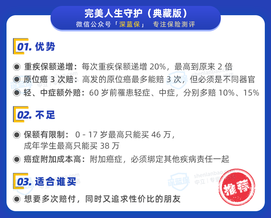 完美人生守护(典藏版)作为多次赔付重疾险,性价比还不错,我们做了简要总结如下: