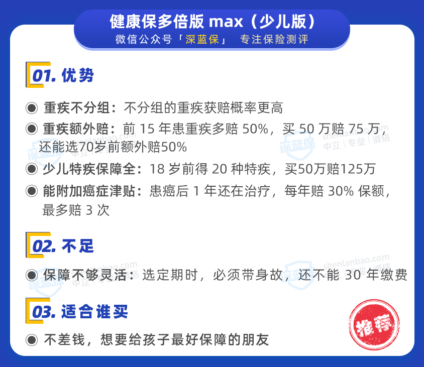 健康保多倍版max是不分组多次赔的重疾险,它的特点总结如下: