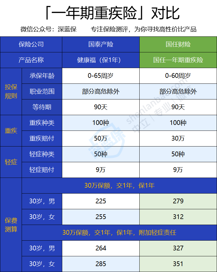 我们将它跟同样是一年期重疾险的国泰健康福对比看看: