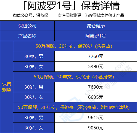 在阿波罗1号中,以30岁男性投保50万保额,分30年交费为例,不附加任何其他保障的情况下,保到终身,每年需要交7630元,而同样的条件下,保到70岁(含身故)是7230元,相差370元,差别并不大。