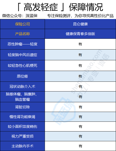 与市面热销重疾险相比,健康保青春多倍版的表现依旧抗打,保障很全面,重疾能赔3次,间隔期也只要1年,轻/中症都能额外赔,还有针对25种特疾的双倍赔付。