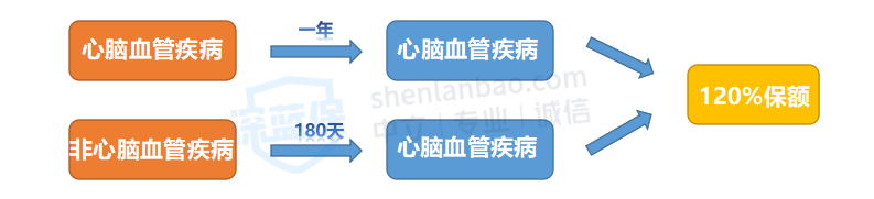 首次重疾为非特定心脑血管疾病,180天后,确诊特定心脑血管疾病,赔付120%保额。