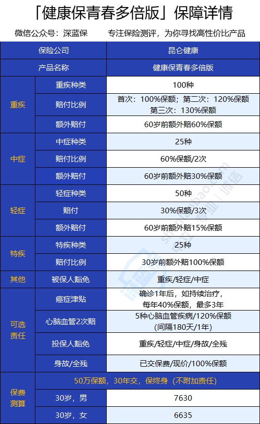 它保障100种重疾,可以不分组赔付3次,30岁前患少儿特疾还能赔双倍;还有癌症津贴和心脑血管2次赔的可选责任。最长能保到终身,保费不贵,性价比不错。