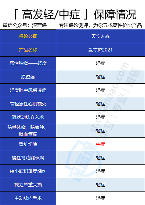 这款产品对于对高发轻/中症的覆盖率是100%,且“肾脏切除”,按照中症进行赔付。