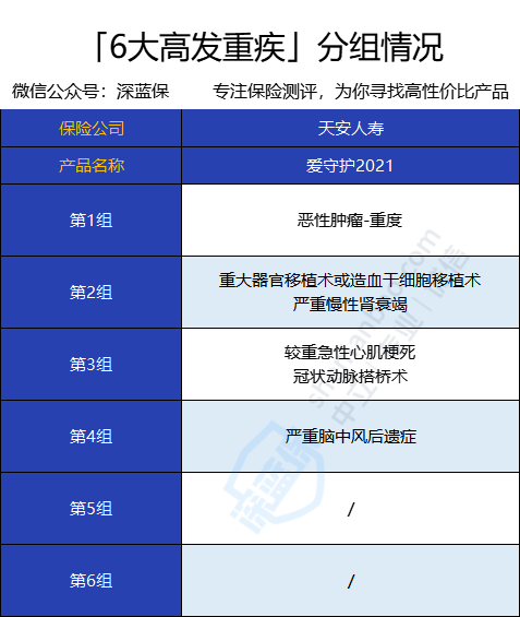 保障120种重疾,分6组,最高可赔付6次,每次间隔180天。