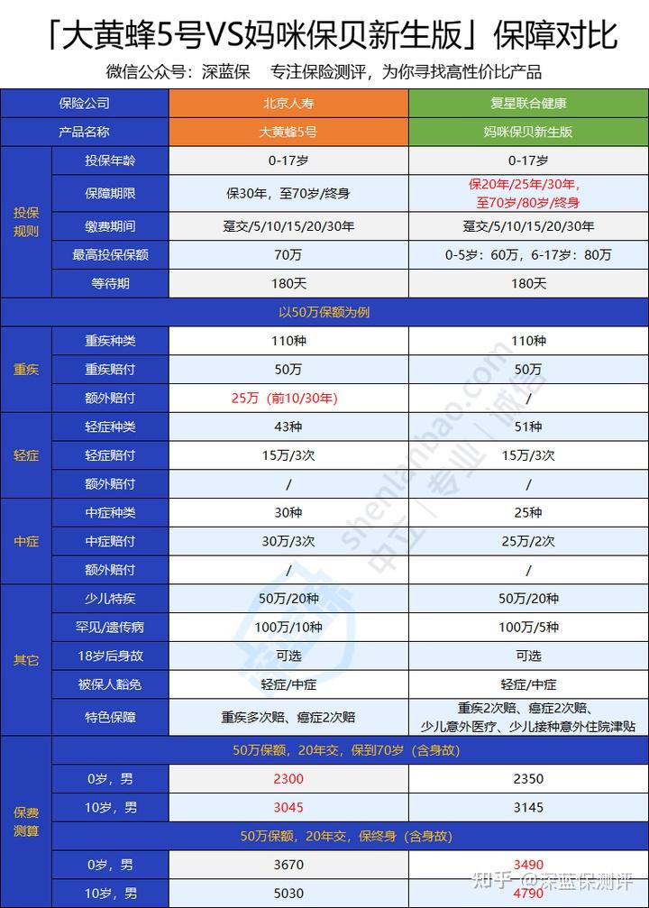 总的来说,两款产品都是十分优秀的重疾险,在某些方面,大黄蜂5号要优于妈咪保贝新生版,比如: